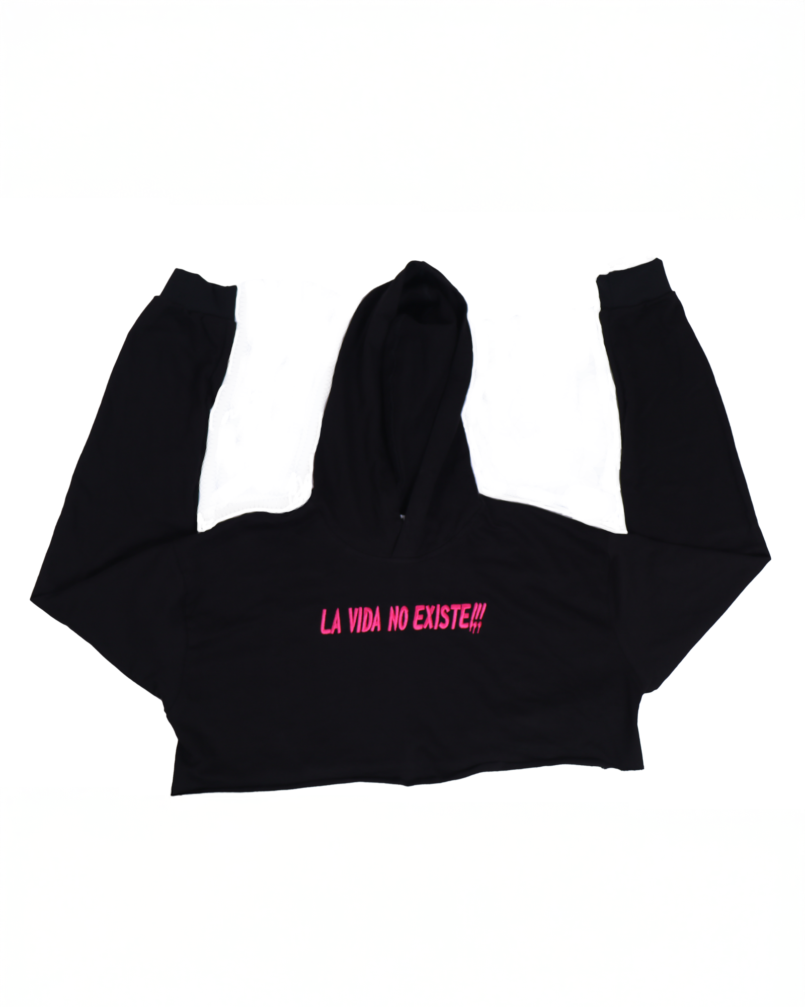 Crop hoodie negro con estampado rojo “LA VIDA NO EXISTE”. Diseño urbano, cómodo y moderno, ideal para un look audaz y contemporáneo.