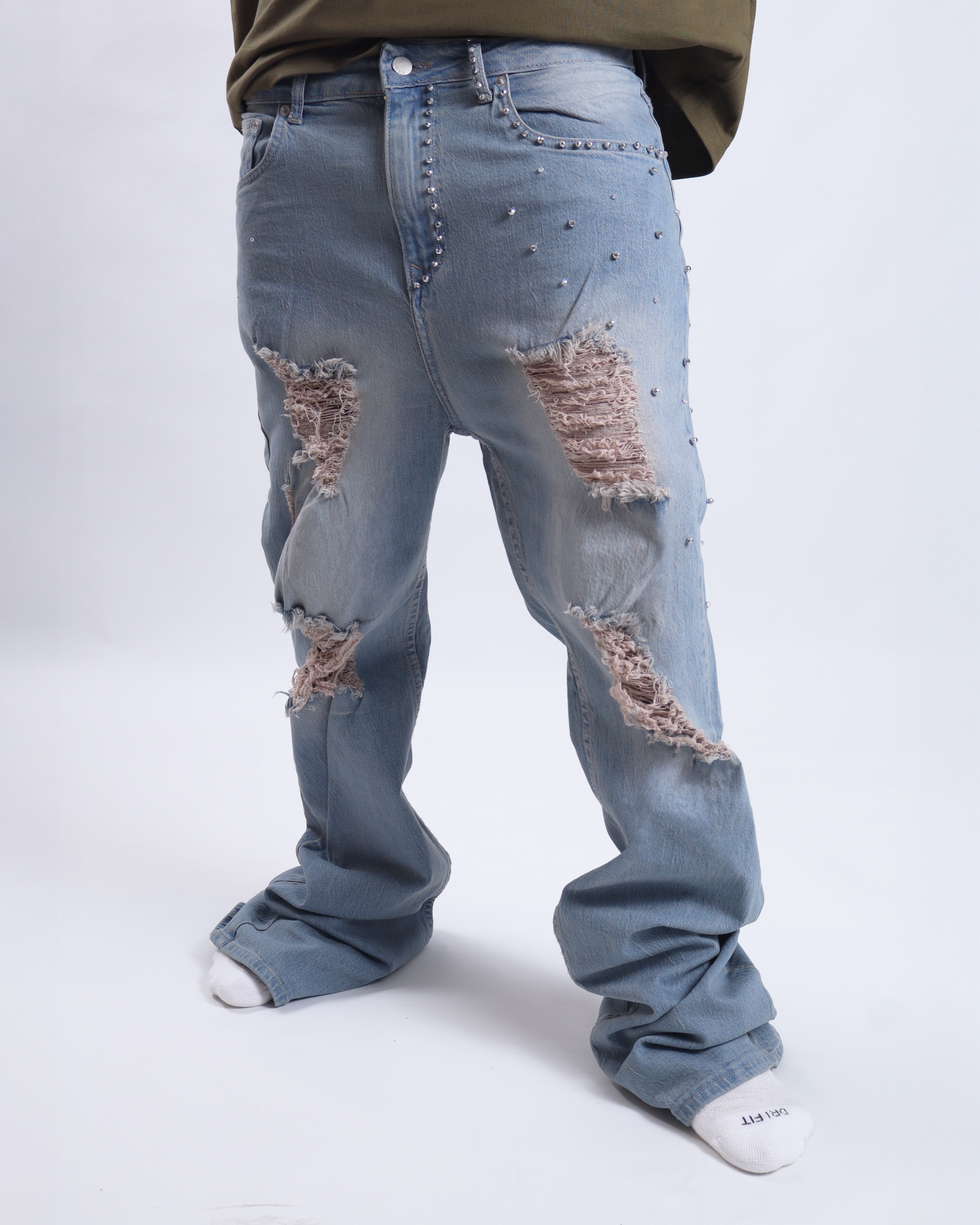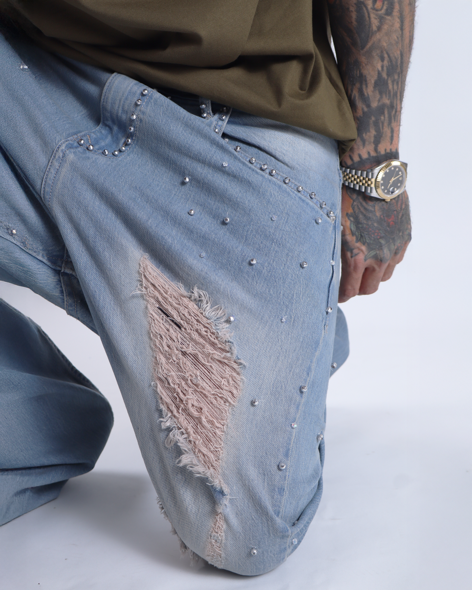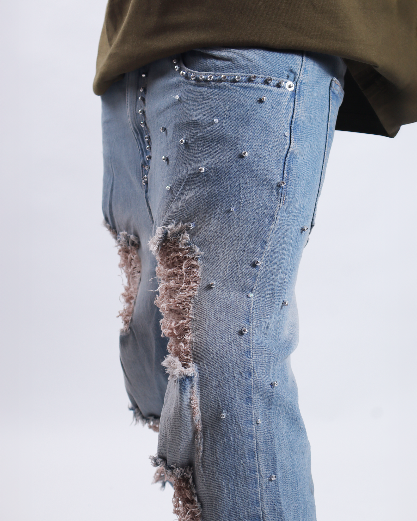 El Jean “Elaborado Perlas” redefine el estilo urbano con un toque sofisticado. Confeccionado en mezclilla de alta calidad, este diseño destaca por sus detalles en perlas aplicadas cuidadosamente y su acabado desgastado, logrando un balance perfecto entre elegancia y actitud streetwear.