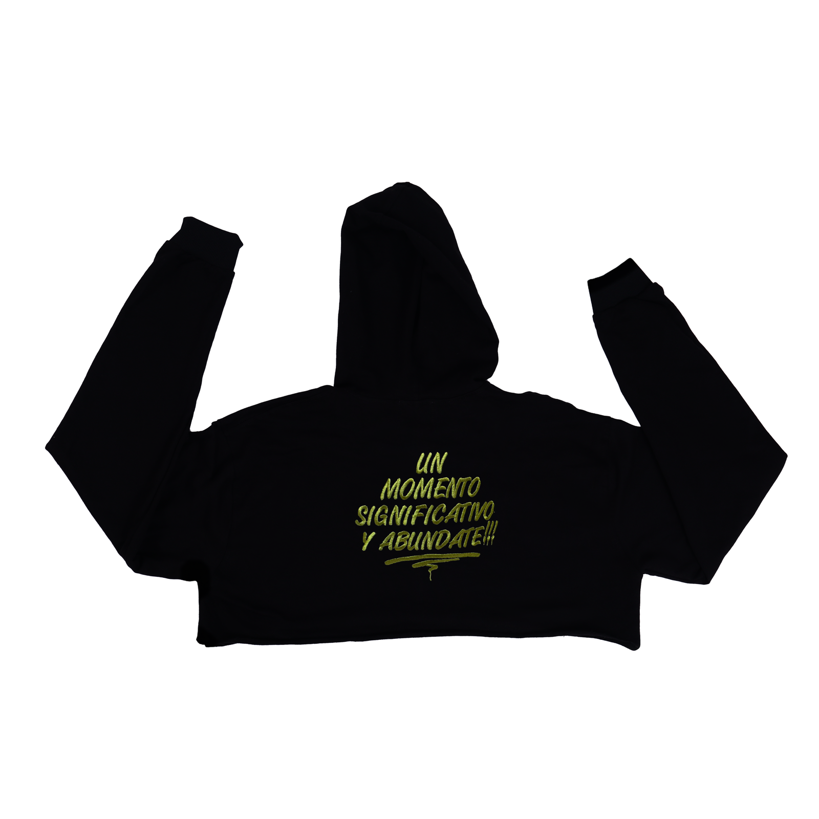 Crop hoodie negro con estampado rojo “LA VIDA NO EXISTE”. Diseño urbano, cómodo y moderno, ideal para un look audaz y contemporáneo.